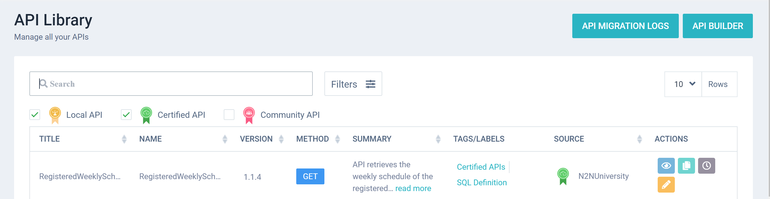 To search for an API, navigate to the API Library module. Once there, a search bar will be displayed at the top of the API list. This search bar will actively filter APIs as you type to include only APIs matching the input in one of the following ID categories: Group Name, API Name, Description, API Tags, or Version.