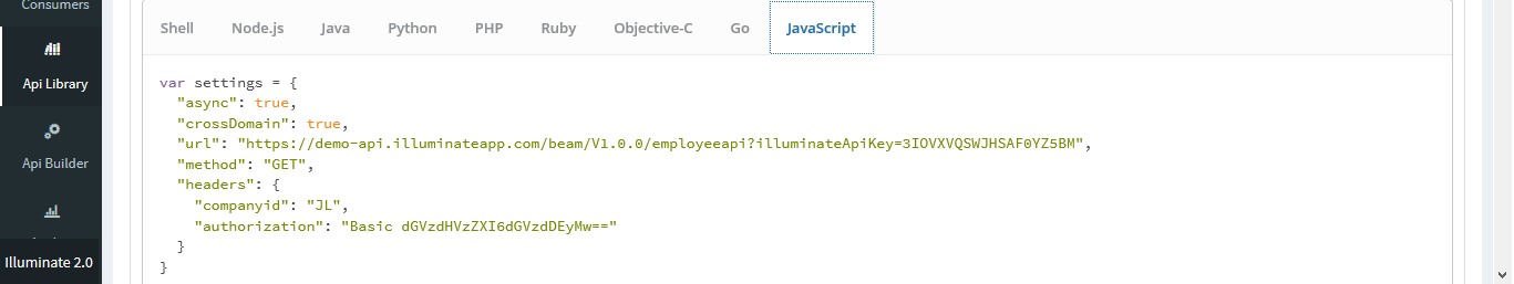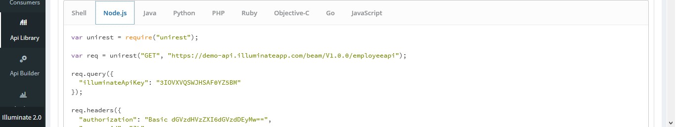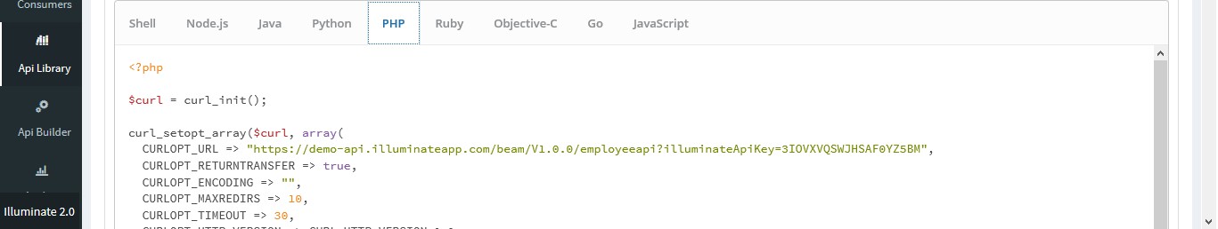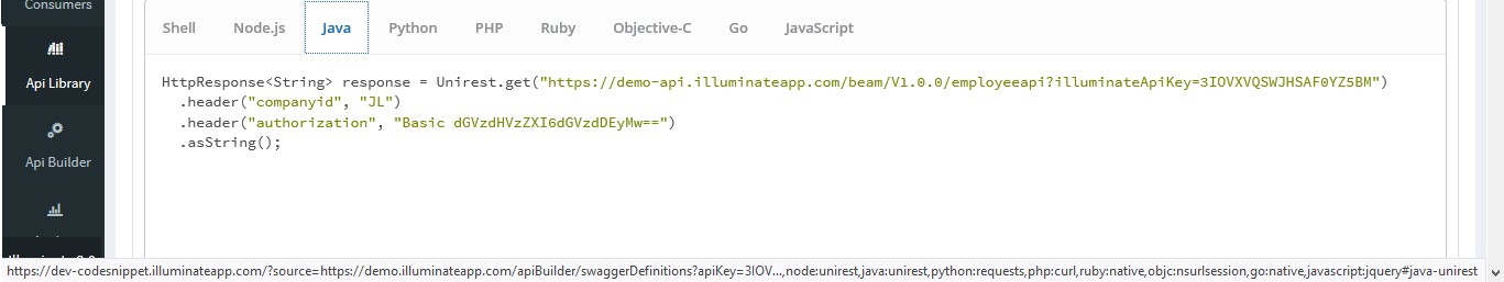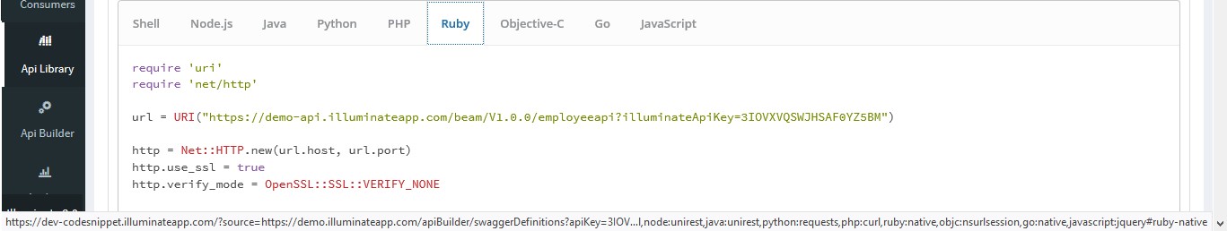 Once in the “Try it Out” interface, click on the API to expand it, then click on the “Code Snippets” button. From here, select one of the 9 available languages to generate the appropriate code snippet as depicted below.
