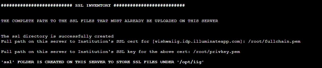 The next section is about SSL certificates, where you need to enter the full path to the complete SSL certificate(chain cert) and the matching private key that are uploaded on the server. The script will also create a folder named