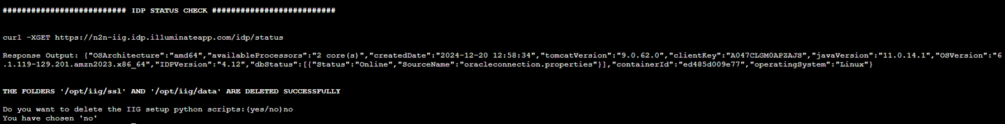 /opt/iig/ssland/opt/iig/dataare deleted, and the idp status is displayed. Finally, the script prompts you to confirm the deletion of the IIG setup Python scripts and the/opt/iigfolder.