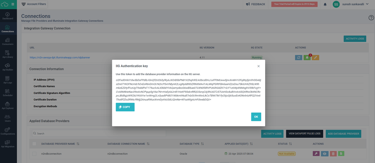 - Add the database provider and generate an authentication token to establish a connection with the existing IIG. This step applies to both adding a new database connection and updating or reestablishing an existing connection when there are changes to the credentials (e.g., host, username, password, etc.)