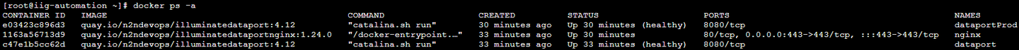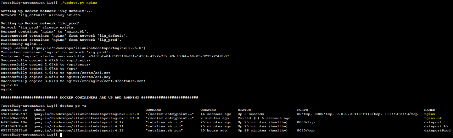 nginxargument. This will copy the SSL certificates and config files from the existing NGINX to the new NGINX Docker container and automatically attach it to the existing Docker network. If dataport and dataportProd are hosted on the same server, the new NGINX container will connect to both the Docker networks that dataport and dataportProd are connected to. The previous version of NGINX will be renamed tonginx.bkand it will disconnect from the Docker network